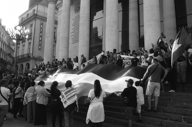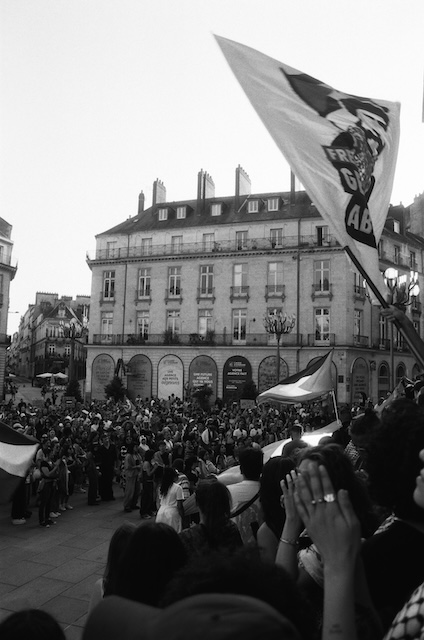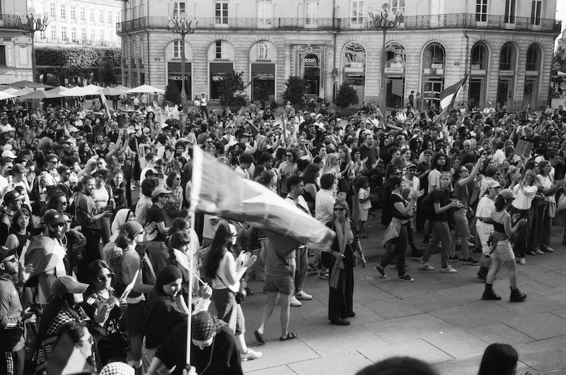 Réalisation d’une série de photos lors d’une manifestation pour la cause palestinienne. Elle a eu lieu peu avant l’été 2025 à Nantes. Mon but a été de documenter cette manifestation en mettant en avant le monde mobilisé, certains symboles et les décors nantais en fond.