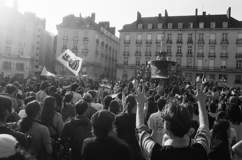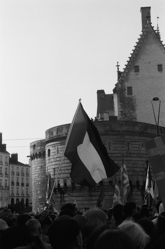 J’aime le fait d’avoir réussi à photographier les mêmes drapeaux à plusieurs moments de la manifestation. Mes images préférées sont celles lors de la prise de parole sur les marches du Théâtre Graslin. Les drapeaux, la beauté d’une foule cosmopolite mobilisée couplée à la grandeur des bâtiments créent de belles compositions.